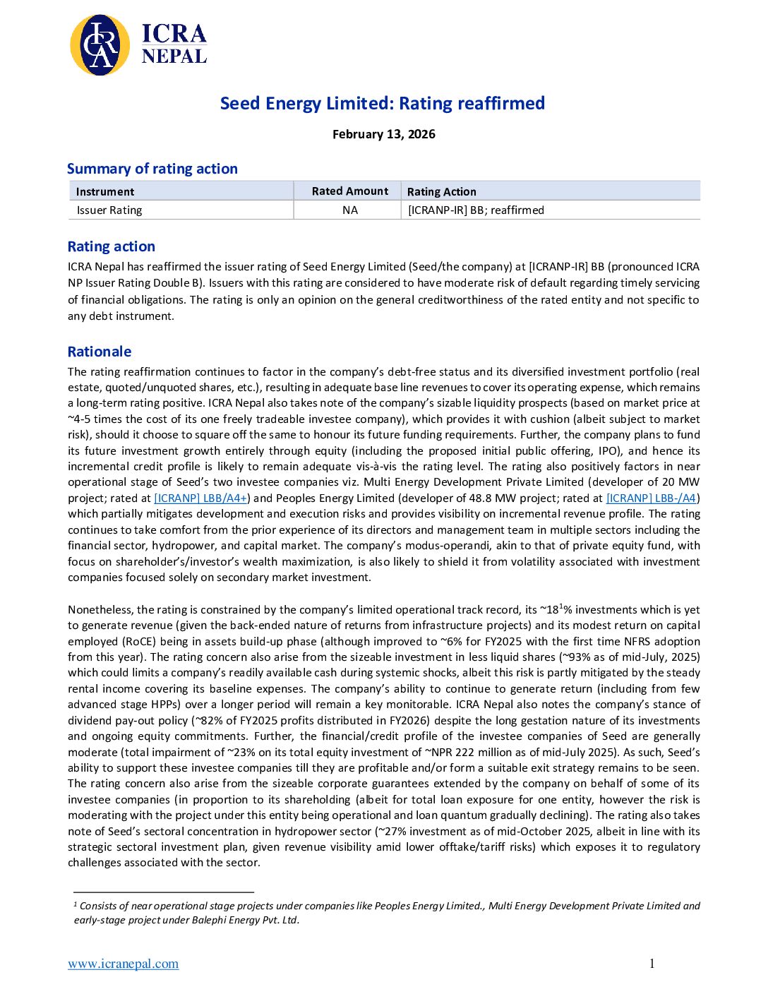 View Larger Image Seed Energy Limited_Issuer Rating Surveillance Februrary 2026.pdf.pdf Download File Type: pdf File Size: 283 KB Categories: 2082-83 Tags: Surveillance Report prashant2026-03-20T15:20:45+05:45March 20, 2026|Comments Off on Seed Energy Limited_Issuer Rating Surveillance Februrary 2026.pdf.pdf Share This Story, Choose Your Platform! FacebookXRedditLinkedInWhatsAppTelegramTumblrPinterestVkXingEmail